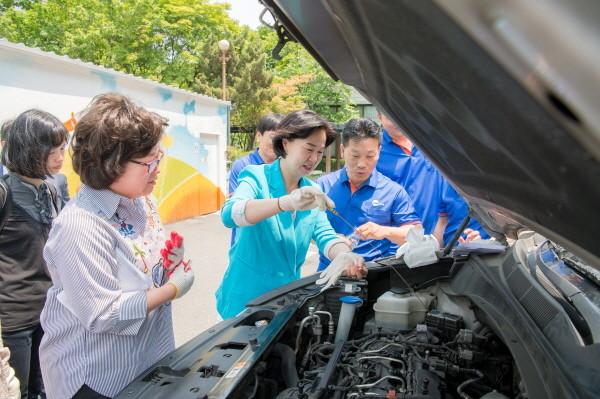 | ▲ 상반기 진행된 자동차 정비교실에서 김수영 구청장이 오일점검을 하고있다.(사진제공=양천구청) | ||