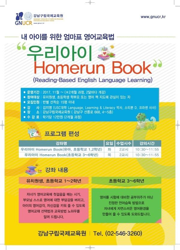 이명옥 구 교육지원과장은 “‘우리아이 Homerun Book’ 강좌는 자녀들이 영어를 지루한 공부가 아닌 자연스러운 습관으로 느낄 수 있도록 하는 비법 전수는 물론 부모들의 사교육비 부담도 덜어줄 것으로 기대된다”고 전했다.