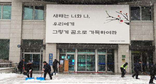 | ▲ 지난해 구청 앞 제설작업에 한창인 직원들.(사진제공=동대문구청) | ||