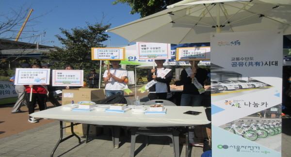 | ▲ 성동구 관계자들이 ‘용답 억새축제’ 행사장에서 친환경 교통사업을 홍보하고 있다.(사진제공=성동구청) | ||
