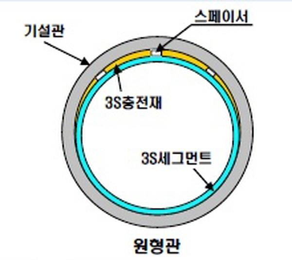 ‘3S 세그먼트 공법’은 투명하고 가벼운 갱생용 플라스틱을 인력으로 조립 후 기설관의 틈새에 충전재(특수 모르타르)를 주입해 일체화된 복합 파이프를 구축하는 공법으로, 기존 굴착공법보다는 협소한 공간에서 대형, 특수기계를 사용하지 않고 분할시공 및 양방향 동시시공이 가능해 공사기간 단축 및 주민불편 최소화가 가능할 것으로 예상되는 공법이다.
