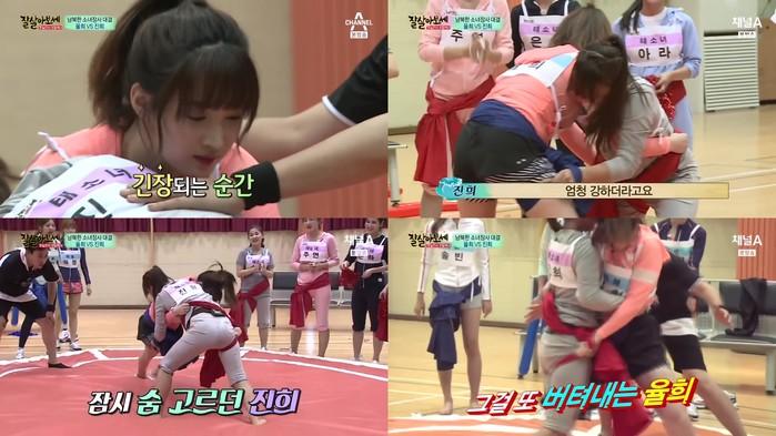 이어 출연자들은 체육대회를 열었다. 올림픽을 방불케하는 체육대회에서 하이라이트인 씨름 순서가 됐다. 특히 탈북미녀 량진희와 라붐의 막내 율희의 힘대결에 관심이 모아졌다. 량진희는 이미 남자들을 압도하는 힘을 선보인바 있고, 율희는 팀 멤버들이 인정하는 괴력녀였다.