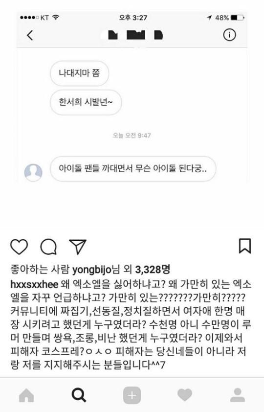 한서희는 과거 자신의 인스타그램에 "왜 엑소엘을 싫어하냐고? 왜 가만히 있는 엑소엘을 자꾸 언급하냐고?"라는 글을 게재했다.