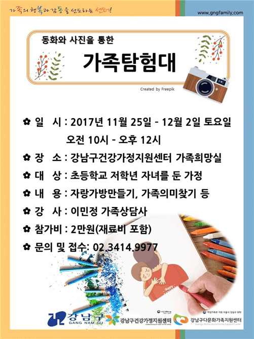 프로그램은 오는 25일~12월2일 오전 10시~낮 12시 강남구건강가정지원센터 가족희망실에서 ▲우리가족의 자랑 ▲가족의미찾기 등의 활동으로 진행된다.