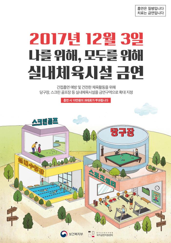 실내 체육시설은 금연구역이라는 사실을 알리는 표지를 달아야 하며, 이를 지키지 않을 경우 시정명령이 부과된다. 금연구역 표지 의무를 계속 위반할 경우 1차 170만원, 2차 330만원, 3차 500만원의 과태료가 부과된다. 또한, 실내 금연구역에서 흡연할 경우 10만원의 과태료도 부과된다.