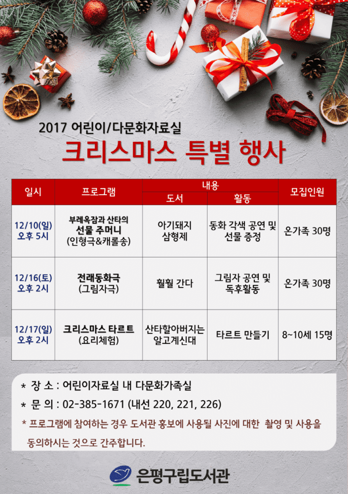 그림책 '아기돼지 삼형제'를 각색한 인형극 '부레옥잠과 산타의 선물 주머니' (10일), 우리 전래동화 그림자극 '훨훨 간다' (16일) 외 크리스마스 타르트 만들기 요리체험 (17일)이 진행될 예정이다.