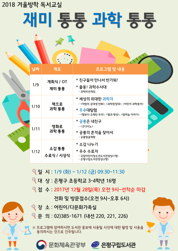 겨울 독서교실은 28일부터 접수 가능하며, 관련 문의는 은평구립도서관 홈페이지 및 어린이·다문화자료실에서 받고 있다.