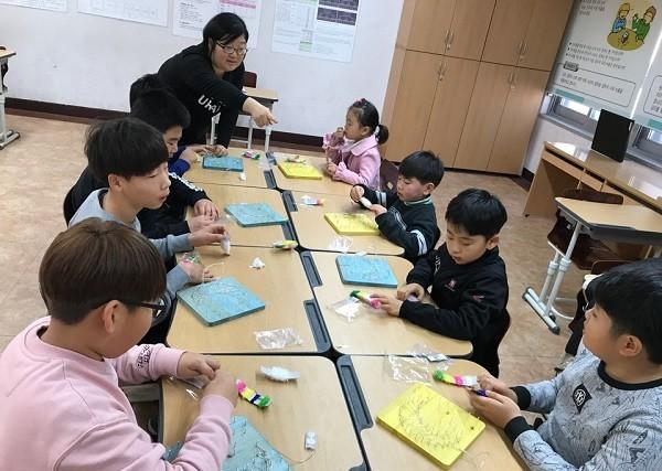 | ▲ 겨울방학을 이용해 초등학생 대상 스트링공예 프로그램을 운영하고 있는 해남교육지원청(사진) | ||