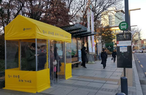 | ▲ 영등포구청 버스정류장에서 설치된 온기텐트에서 휴식을 취하고 있는 지역주민들의 모습. (사진제공=영등포구청) | ||