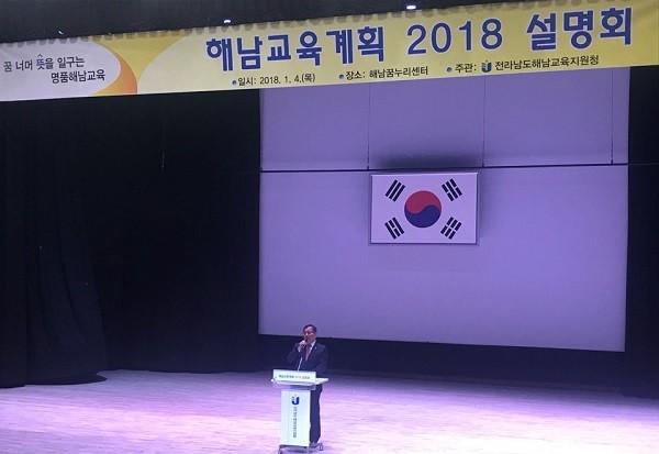 | ▲ 해남교육청의 명품해남 교육을 위한 '해남교육 2018 설명회' 에서 올해 교육방향을 설명하고 있는 김종남 해남교육장(사진) | ||