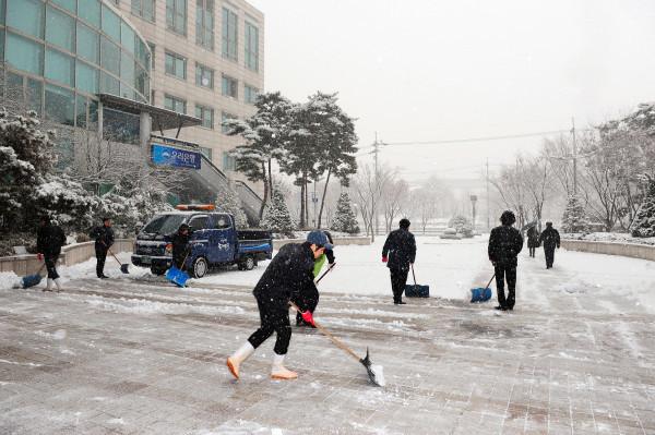 | ▲ 동대문구청 직원들이 구청 청사주변 제설작업을 하고 있다. (사진제공=동대문구청) | ||