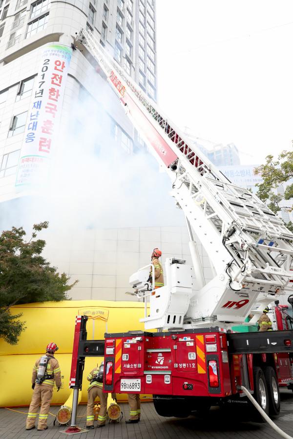 | ▲ 다중이용안전시설에 대한 화재 진화 훈련을 하고 있는 성동소방서 관계자들의 모습. (사진제공=성동구청) | ||
