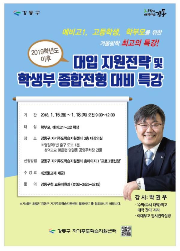 [시민일보=이대우 기자] 서울 강동구가 오는 12일까지 ‘2019학년도 이후 대입지원전략 및 학생부종합전형 대비 특강’에 참석할 학생·학부모를 모집한다고 10일 밝혔다.