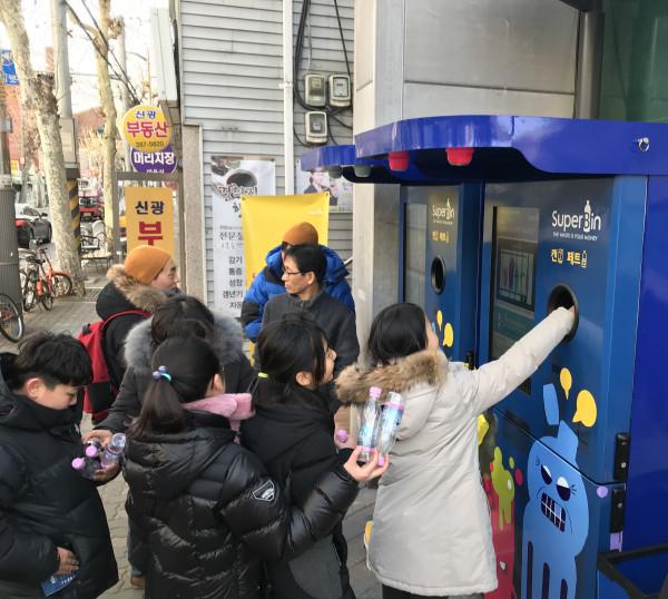 | ▲ 서울 은평구 아동과 주민들이 시연회에 참가해 네프론에 분리수거를 하고 있는 모습. (사진제공=은평구청) | ||