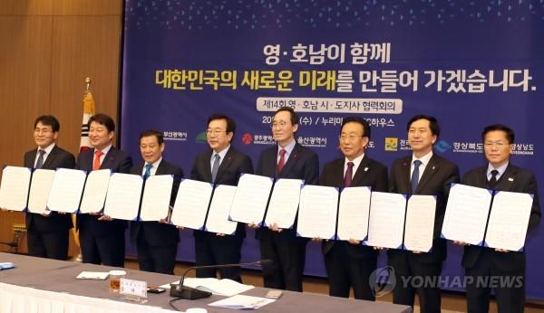특히 국토의 균형발전과 주민들의 교통복지 개선을 위해 김천~거제 간 남부내륙철도 조기착공, 목포~부산 간 남해안철도 전철화 등 광역 교통망 건설에도 영호남이 같이 힘을 모으기로 했다.