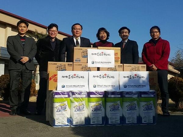 | ▲ 다가오는 설명절을 맞아 관내 사회복지시설에 위문품을 전달한 김종남 해남교육지원청 교육장(사진 좌 3)과 교육청 직원 및 시설관계자들 | ||
