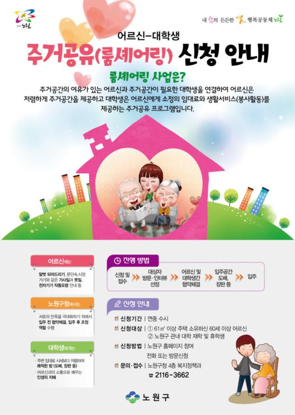 한편 구는 주거공간의 여유가 있는 노인가구와 주거공간이 필요한 대학생을 대상으로 룸셰어링 참여자를 연중 수시모집하고 있다.