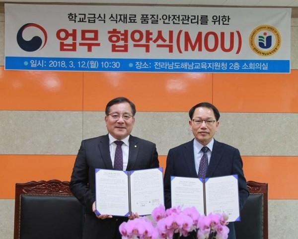 | ▲ 학교급식 식재료 품질 안전관리를 위해 업무협력 양해각서(MOU)를 체결한 김종남 해남교육지원청교육장(사진 좌측)과 김성담 국립농산물품질관리원 전남지원 해남·진도사무소장 | ||