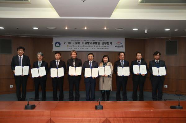 | ▲ ‘도봉형 마을방과후활동 운영을 위한 업무협약식’에 참석한 관계자들이 협약서를 들고 기념촬영을 하고 있다. (사진제공=도봉구청) | ||