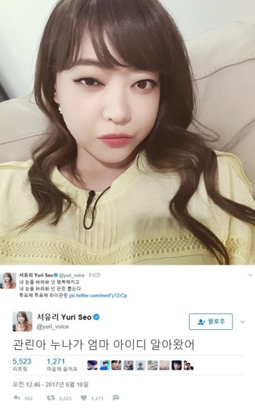서유리는 과거 자신의 SNS에 "내 눈을 바라봐 넌 행복해지고 내 눈을 바라봐 넌 관린 뽑는다. 투표해. 투표해. 라이관린"이라는 글과 함께 한 장의 사진을 게재했다.