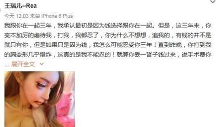 왕루이얼(王瑞兒)은 자신의 웨이보 계정에 "지난 3년간 갖은 고문과 구타가 있었음에도 너를 사랑했지만 더이상 참을 수 없다"라는 글과 함께 연인에게 데이트폭행을 사진을 게재해 눈길을 끌었다.