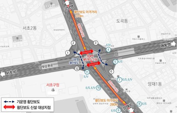 하지만 횡단보도 설치는 해당 구간이 강남대로와 남부순환로가 교차하고, 시간당 8000여대의 차량통행과 강남대로 중앙버스 전용차로 운영 등 교통체증이 가중될 수 있다는 우려때문에 진행이 더뎌졌고, 이번에 구가 교통섬 축소와 도로선형을 조정하는 등의 대안을 제시해 횡단보도 신설이 가능하게 됐다.