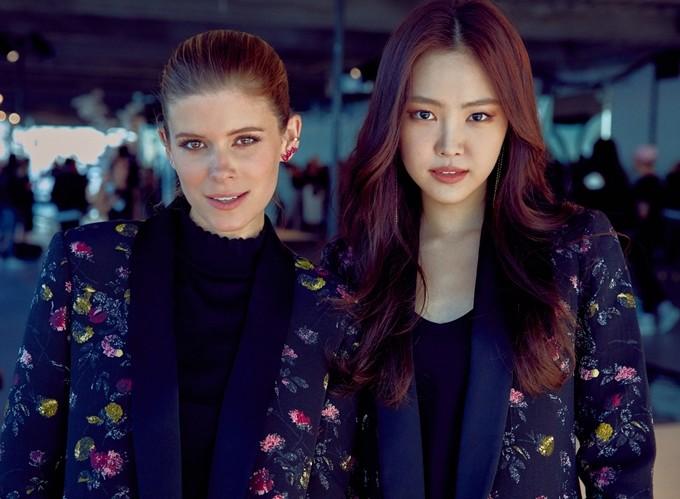 특히 손나은은 같은 패턴의 의상을 착용한 인기 헐리웃 스타 '케이트 마라(Kate Mara)'와도 다정한 포즈를 취해 보이며 글로벌 패셔니스타로서의 입지를 다졌다.