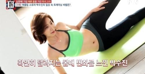 제작진에 따르면 슈가 시절엔 빈약한 몸매 때문에 몸매 관리하기에 관심이 많던 그녀는 2011년 요가 강사 역으로 한 드라마에 출연하면서 요가를 시작하고 웨이트 트레이닝을 병행해 애플힙, 대문자 S라인까지 소유하게 됐다.