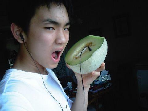 사진 속 키는 음원사이트와 발음이 비슷한 과일 메론에 이어폰을 꼽고 익살스러운 표정으로 카메라를 응시하고 있다.