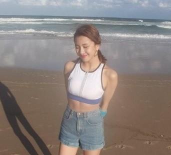 사진 속 채영은 비키니 상의에 데님 반바지 차림으로 호주의 해변을 거닐고 있다.