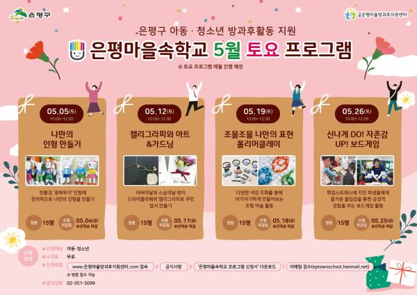[시민일보=이대우 기자] 서울 은평구 은평마을속학교가 오는 5~26일 매주 토요일, 지역내 아동·청소년을 대상으로 ‘방과후 프로그램’을 운영한다.