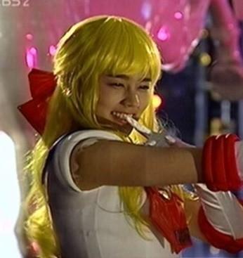 사진 속에서는 일본 애니메이션 ‘세일러문’의 주인공처럼 한가인이 노란머리 가발을 쓰고 세일러복을 입은 채로 깜찍하게 세일러문의 포즈를 취하고 있다.