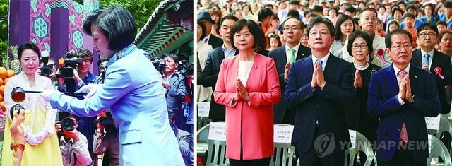 더불어민주당 추미애 대표가 부처님오신날인 22일 오전 대구 동화사에서 열린 팔공총림 봉축대법회에 참석해 아기 부처님을 목욕시키고 있다(왼쪽). 정의당 이정미, 바른미래당 유승민, 자유한국당 홍준표 대표도 이날 오전 서울 종로 조계사에서 열린 봉축법요식에 참석해 합장하고 있다.