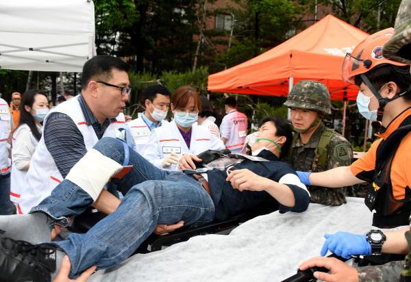 광진구가 최근 자양동 동서울우편집중국에서 점점 다양해지는 도시형 재난에 대응하기 위해 ‘2018 재난대응 안전한국훈련’을 실시했다. 사진은 인명구조 및 응급처치 훈련이 진행 중인 모습. (사진제공=광진구청)