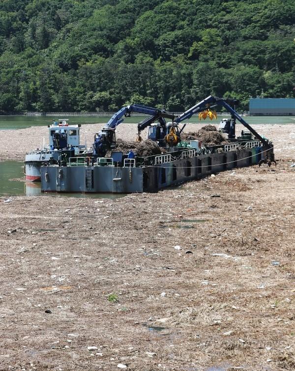 23일 오전 경기도 하남시 팔당댐에서 경기도수자원본부 관계자들이 지난 16∼18일 집중호우로 팔당호에 유입된 부유 쓰레기 수거작업을 하고 있다.