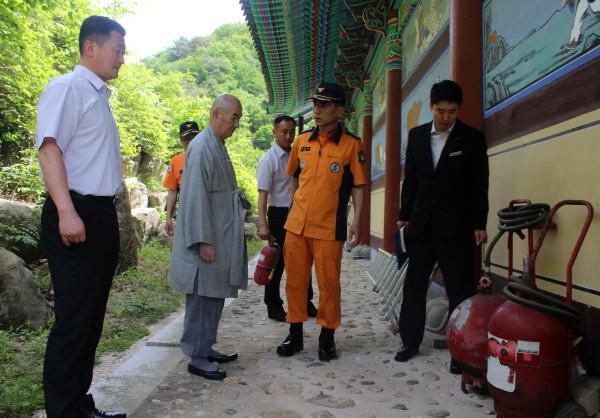 지난 21일 경기 포천소방서는 이동면 도평리에 위치한 흥룡사를 방문해 불기 2562년 ‘부처님 오신날’ 봉축행사의 안전한 행사를 위해 현장방문컨설팅을 실시했다. 사진은 박용호 서장과 스님 및 관계자들이 현장 확인을 진행하는 모습. (사진제공=포천소방서)