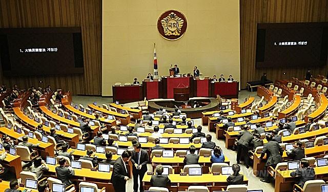 국회가 24일 본회의를 열고 문재인 대통령이 발의한 헌법개정안에 대해 표결을 했으나 의결정족수 부족으로 투표가 성립되지 못했다. 정세균 국회의장이 24일 오전 열린 국회 본회의에서 의결정족수 부족을 이유로 정부 개헌안의 투표 불성립을 선언하고 있다.