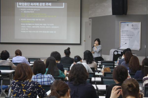 경기 부천교육지원청 Wee센터는 24일 대회의실에서 학교별 학업중단 숙려제 및 예방사업 운영담당자 150여명을 대상으로 연수를 개최했다. 사진은 중원고 김광희 교감이 학업중단 숙려제 운영지침을 전달하는 모습. (사진제공=부천교육지원청)
