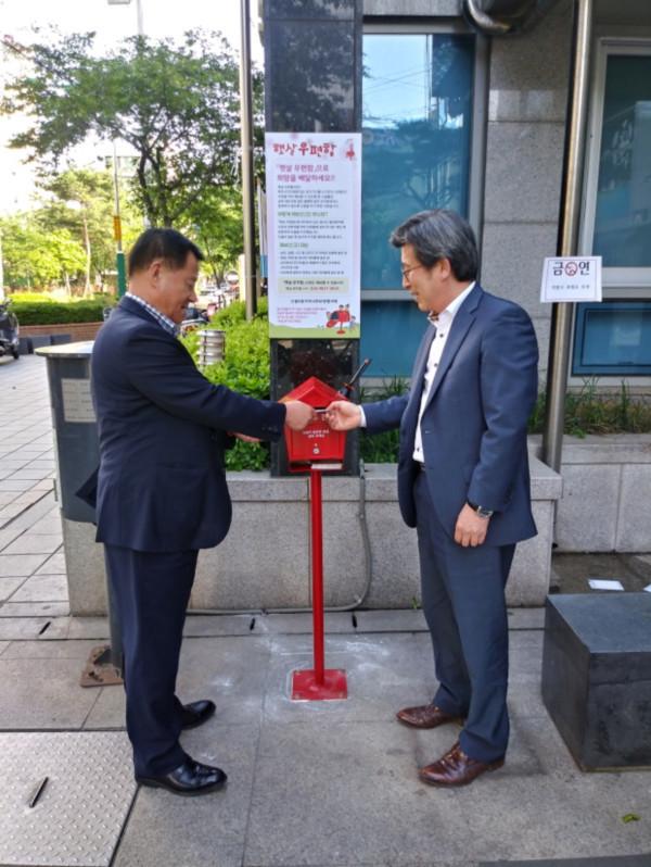 지난 23일 서울 양천구가 신월5동 주민센터 입구에 누구나 위기가구를 제보할 수 있는 빨간색 ‘햇살 우편&문자함’을 설치하고, 복지사각지대 발굴에 나섰다. 사진은 햇살우편함에 편지넣는 신월5동지역사회보장협의체 황원석위원장(왼쪽)과 최성덕 신월5동장(오른쪽)의 모습. (사진제공=양천구청)