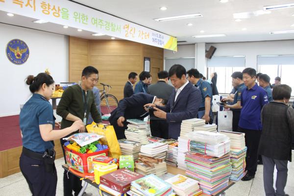 경기 여주경찰서는 25일 경찰서 강당에서 기부와 나눔의 문화를 활성화하고 직원 사기진작을 도모하기 위해 자선 바자회 '열린 장터'를 개최했다. 사진은 직원들이 물품을 고르고 있는 모습. (사진제공=여주경찰서)