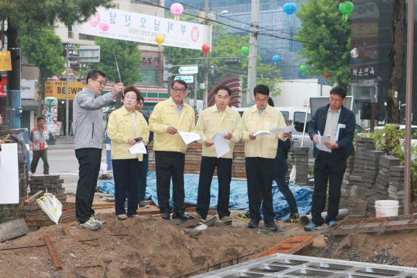 서울 강북구의회 복지건설위원회가 제214회 임시회 기간 중 3일간에 걸쳐 강북 보훈회관 신축 공사현장, 화계천 복개구조물 도로정비 공사현장, 솔밭근린공원 바닥분수 설치 공사현장, 도시재생지원센터 등 주요사업현장 4곳을 방문해 진행 상황을 청취한 뒤 현장을 확인하고 있다. (사진제공=강북구의회)