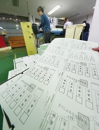 제7회 전국동시지방선거를 16일 앞둔 28일 오전 경기 수원시의 한 인쇄소에서 직원들이 인쇄된 경기도 교육감 선거 투표용지를 정리하고 있다.