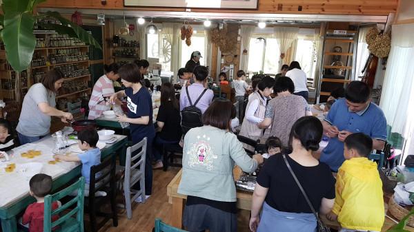 인천 계양구 드림스타트는 지난 26일 드림스타트 미취학 아동과 양육자 39명을 대상으로 강화도에 위치한 ‘꽃마니에뜨락’을 방문해 꽃과 함께 하는 다양한 체험 활동을 진행했다. 사진은 참여자들이 꽃잎을 넣은 푸딩젤리만들기를 하고 있는 모습. (사진제공=계양구청)