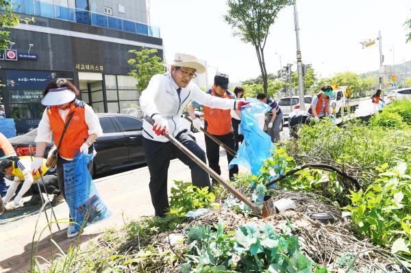 경기 오산시는 지난 25일 도시미관을 해친다고 판단한 6개동 총 9곳의 청소사각지대에서 대대적인 환경정화활동을 실시했다. 사진은 청소사각지대 환경정화활동에 참여한 봉사자들이 도보에 버려진 쓰레기를 수거하고 있는 모습. (사진제공=오산시청)