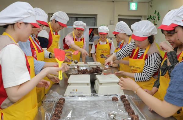 최근 온라인종합쇼핑몰 롯데닷컴이 대한적십자사 서울시지사 중앙봉사관에서 사랑의 빵 나누기 봉사활동에 나서며 직접 만든 빵을 지역 취약계층에 기부했다. 사진은 롯데닷컴 임직원들이 열심히 팥빵을 만들고 있는 모습.(사진제공=대한적십자사 서울시지사)