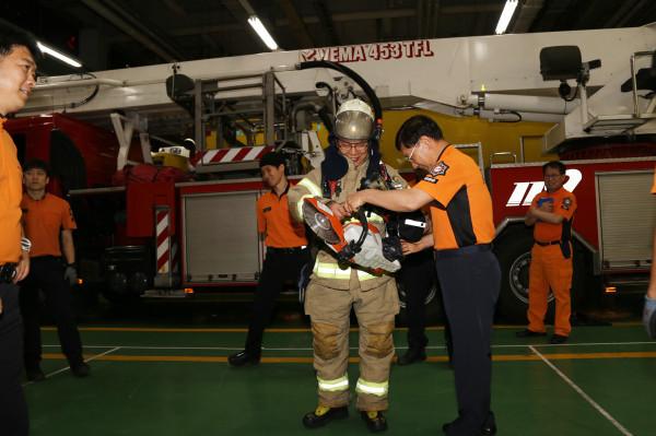 최근 이종수 행정안전부 재난안전관리본부 안전개선과장이 일선 소방관의 고충을 느끼기 위해 출동이 많은 강남소방서에서 1박2일 동안 합숙하며 현장을 체험했다. 사진은 이 과장이 방화복을 입어보는 모습. (사진제공=강남소방서)