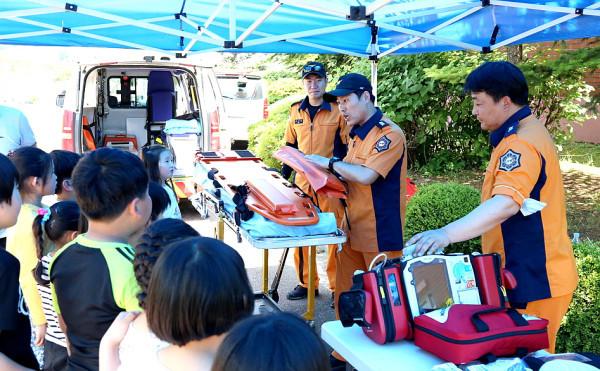 경기 연천소방서는 28일 오후 1시 군남초·중학교 운동장에서 도농 간 안전체험교육 격차해소를 위해 교육부와 협업해 ‘찾아가는 119안전체험교육’을 실시했다. 사진은 체험교육에 참여한 학생들이 소방관의 설명을 듣고 있는 모습. (사진제공=연천소방서)