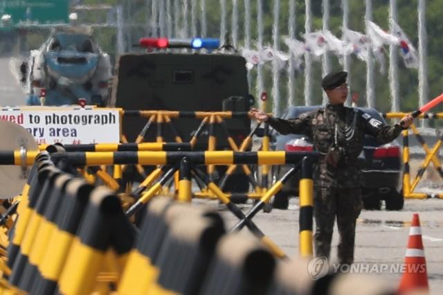 북미정상회담 논의를 위한 북미 실무회담이 진행되고 있는 가운데 28일 경기도 파주시 통일대교에서 공동경비구역(JSA) 차량이 검은 승용차를 호송해 임진강을 건너고 있다.