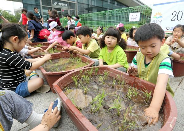 금천구는 29일 오전 10시 구청에 조성된 생태텃논에서 ‘고사리손과 함께하는 텃논 모내기’ 체험 행사를 가졌다. 이날 행사에는 지역내 5개 어린이집 원생 120여명이 참여했다. 사진은 어린이들이 모내기 체험을 하고 있는 모습. (사진제공=금천구청)