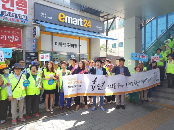 경기 오산시보건소가 30일 ‘제31회 세계금연의 날’을 맞이해 오산역 일원에서 지역사회 및 유관기관, 금연사업 관계자 등과 함께 금연 캠페인을 전개했다. 사진은 캠페인에 참여한 봉사자들이 역 앞에서 금연 홍보를 진행하고 있는 모습. (사진제공=오산시청)